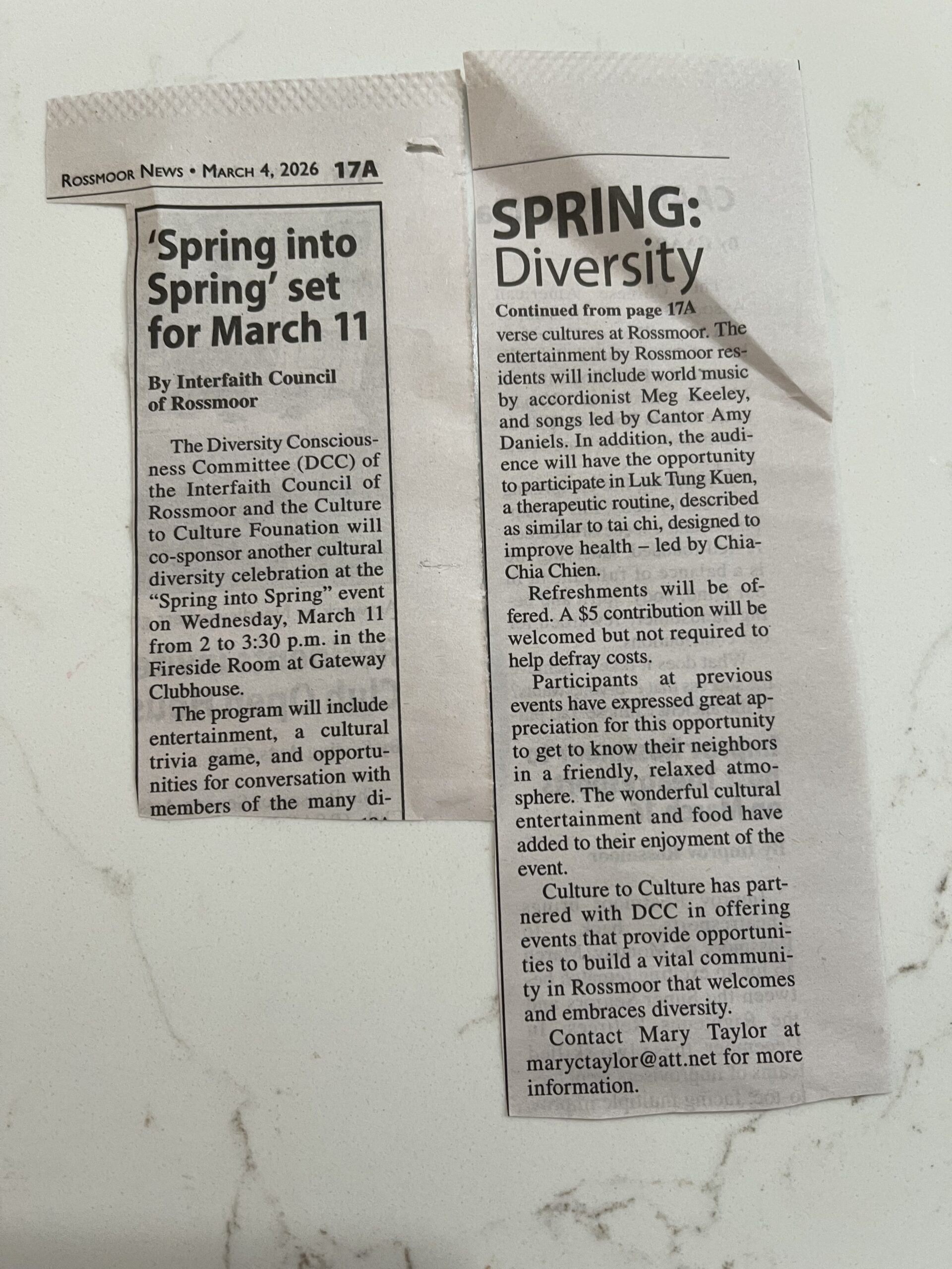 Culture to Culture and the Diversity Consciousness Committee (DCC) of the Interfaith Council of Rossmoor will co-sponsor a cultural diversity celebration at the "Spring into Spring" event on Wednesday, March 11, from 2 to 3:30 pm in the Fireside Room at Gateway Clubhouse.